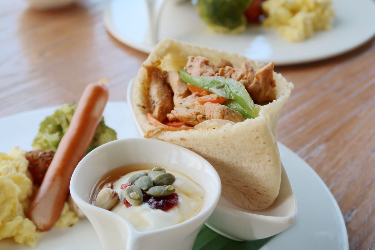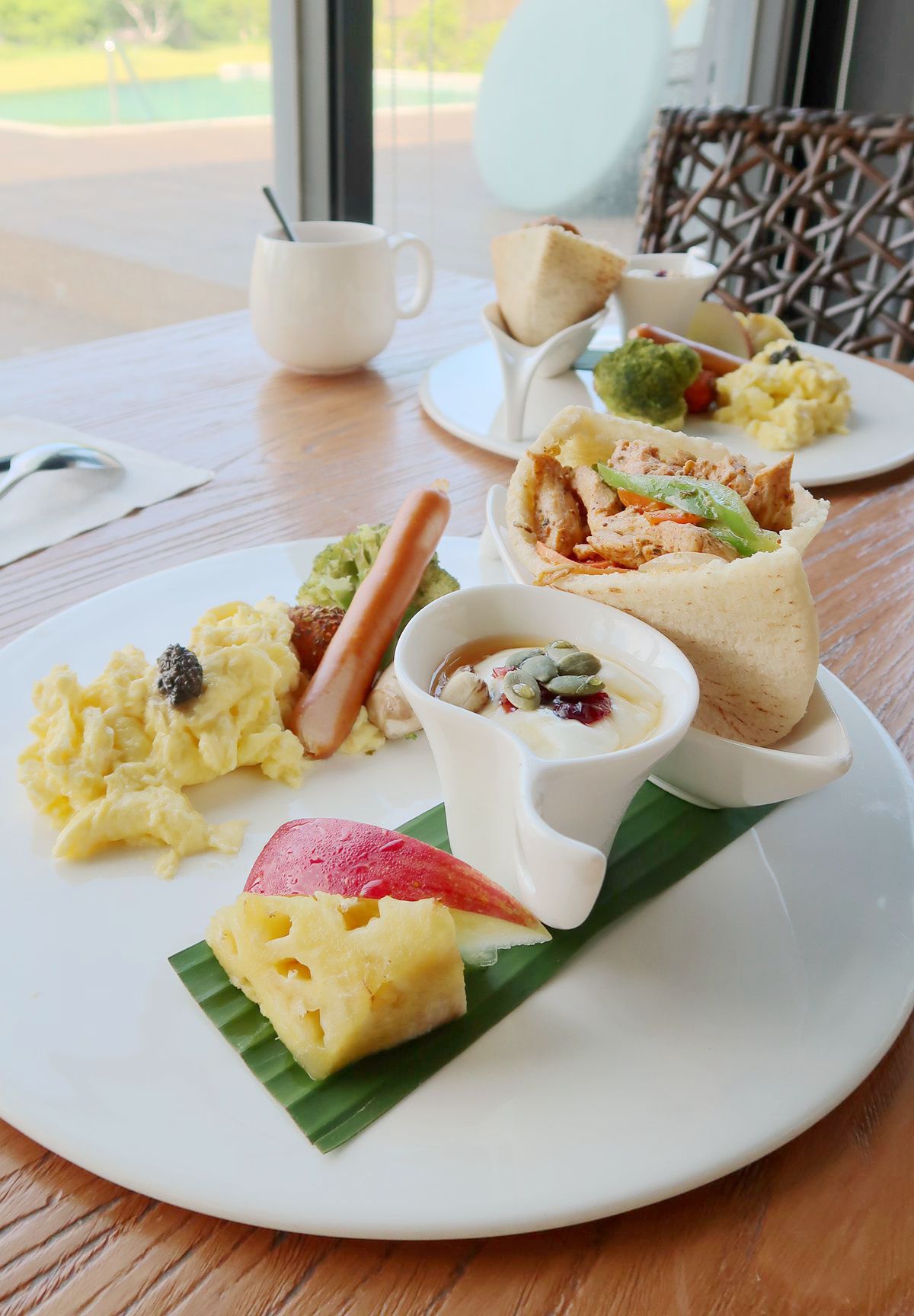餐廳相當明亮,早餐為套餐+自助區;自助區有飲品、吐司,套餐為豬肉口袋餅+炒蛋+水果+優格