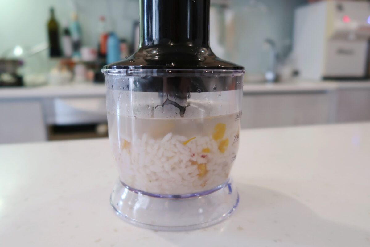 Mo太太作法是先把食材在電鍋煮熟後,再放到大家源無線充電攪拌棒內切碎一點讓寶寶們比較好入口喔